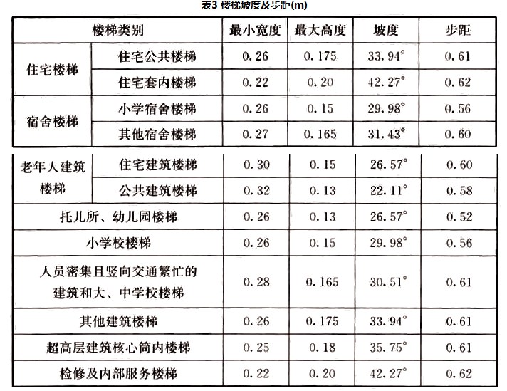 6.8.10 楼梯踏步高宽比是根据楼梯坡度要求和不同类型人体自然跨步(步距)要求确定的,符合安全和方便舒适的要求。坡度一般控制在30°左右。对仅供少数人使用的住宅套内楼梯则放宽要求,但不宜超过45°。步距是按水平跨步距离公式(2r+g)计算的,式中r为踏步高度,g为踏步宽度,成人和儿童、男性和女性、青壮年和老年人均有所不同。一般在560mm~630mm范围内,少年儿童在560mm左右,成人平均在600mm左右。按本条规定的踏步高宽比能反映楼梯坡度和步距。见表3。