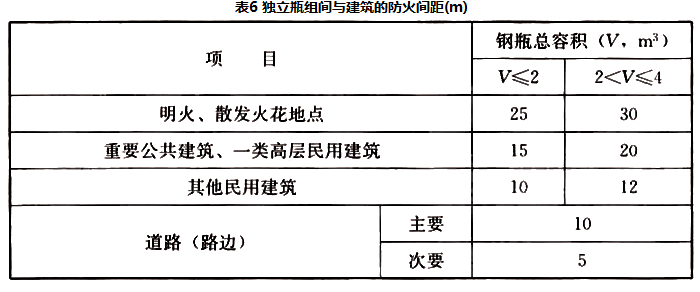 8.4.8 5 国家标准《液化石油气供应工程设计规范》GB 51142-2015第7.0.4条,独立瓶组间与建筑的防火间距应符合表6的规定。