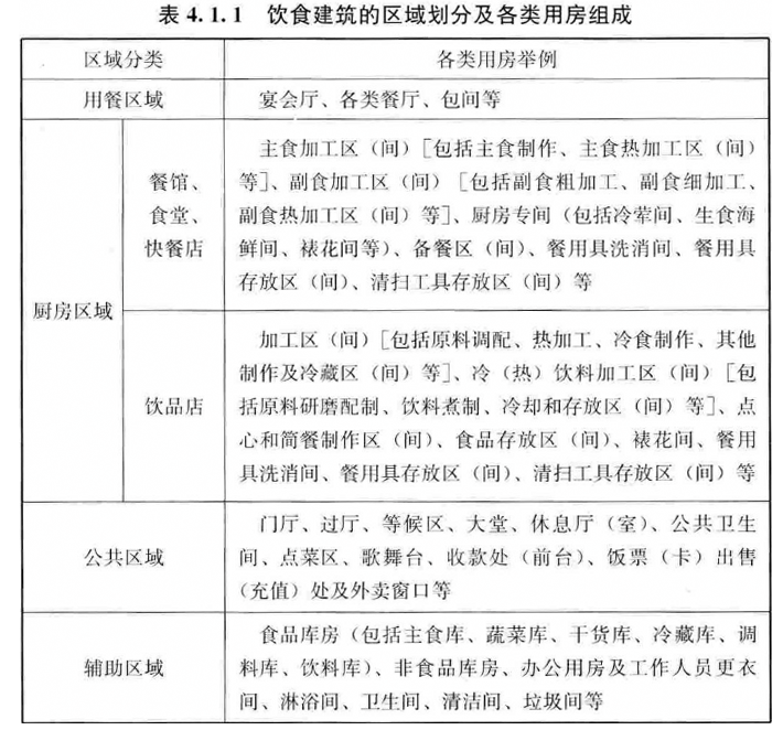 4.1.1 饮食建筑的功能空间可划分为用餐区域、厨房区域、公共区域和辅助区域等四个区域。区域的划分及各类用房的组成宜符合表4.1.1的规定。