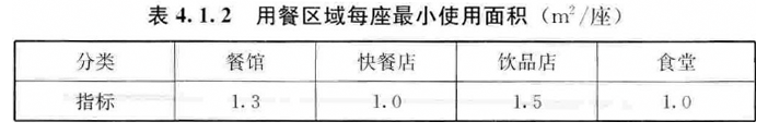 注:1 厨房专间、冷食制作间、餐用具洗消间应单独设置。 2 各类用房可根据需要增添、删减或合并在同一空间。4.1.2 用餐区域每座最小使用面积宜符合表4.1.2的规定。