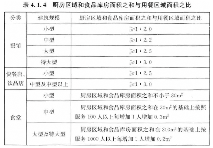 注:快餐店每座最小使用面积可以根据实际需要适当减少。4.1.3 附建在商业建筑中的饮食建筑,其防火分区划分和安全疏散人数计算应按现行国家标准《建筑设计防火规范》GB 50016中商业建筑的相关规定执行。4.1.4 厨房区域和食品库房面积之和与用餐区域面积之比宜符合表4.1.4的规定。