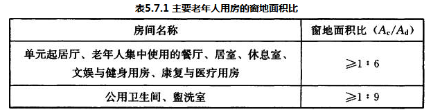 5.7.1 老年人照料设施建筑的主要老年人用房采光窗宜符合表5.7.1的窗地面积比规定。