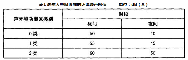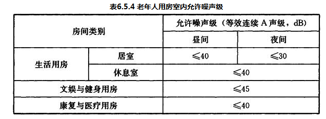 6.5.1 老年人照料设施应位于现行国家标准《声环境质量标准》GB 3096规定的0类、1类或2类声环境功能区。6.5.2 当供老年人使用的室外活动场地位于2类声环境功能区时,宜采取隔声降噪措施。6.5.3 老年人照料设施的老年人居室和老年人休息室不应与电梯井道、有噪声振动的设备机房等相邻布置。6.5.4 老年人用房室内允许噪声级应符合表6.5.4的规定。