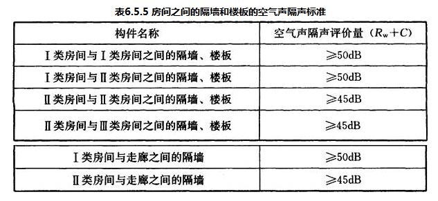 6.5.5 房间之间的隔墙或楼板、房间与走廊之间的隔墙的空气声隔声性能,应符合表6.5.5的规定。