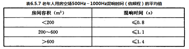 注:Ⅰ类房间——居室、休息室;Ⅱ类房间——单元起居厅、老年人集中使用的餐厅、卫生间、文娱与健身用房、康复与医疗用房等;Ⅲ类房间——设备用房、洗衣房、电梯间及井道等。6.5.6 居室、休息室楼板的计权规范化撞击声压级应小于65dB。6.5.7 老年人用房空场500Hz~1000Hz的混响时间应符合表6.5.7的规定。