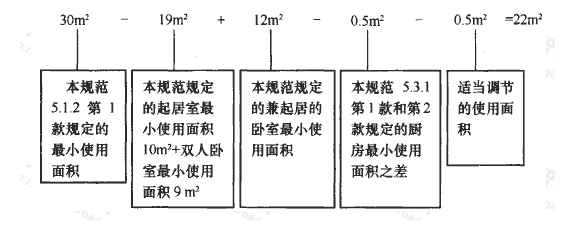 3 原规范规定的由卧室、起居室(厅)、厨房和卫生间等组成的住宅套型,虽然组成空间数不变,但因为综合考虑我国中小套型住房建设的国策,以及住宅部品技术产业化、集成化和家电设备技术更新等因素,各种住宅部品及家电尺寸有所减小,对各功能空间尺度的要求也相应减小。所以将原规范规定不应小于34㎡下调为不应小于30㎡。其具体测算方法是:
