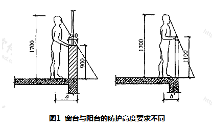 5.6.3 阳台栏杆的防护高度是根据人体重心稳定和心理要求确定的,应随建筑高度增高而增高。阳台(包括封闭阳台)栏杆或栏板的构造一般与窗台不同,且人站在阳台前比站在窗前有更加靠近悬崖的眩晕感,如图1所示,人体距离建筑外边沿的距离b明显小于a,其重心稳定性和心理安全要求更高。所以本条规定阳台栏杆的净高不应按窗台高度设计。