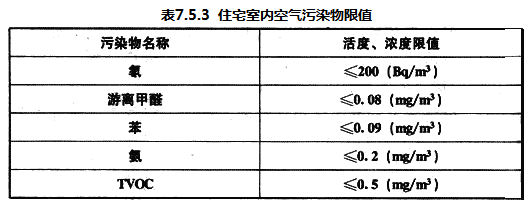 7.5.3 住宅室内空气污染物的活度和浓度应符合表7.5.3的规定。