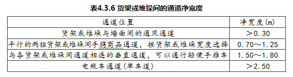 4.3.6 储存库房内存放商品应紧凑、有规律,货架或堆垛间的通道净宽度应符合表4.3.6的规定。