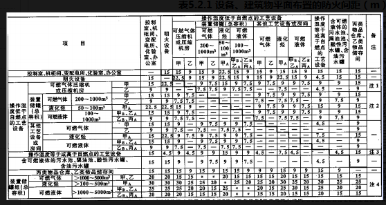 1.当装置储罐总容积:液化烃罐小于或等于100m³、可燃气体或可燃液体罐小于或等于1000m³时,可布置在装置内,装置储罐与设备、建筑物的防火间距不应小于表5.2.1的规定。