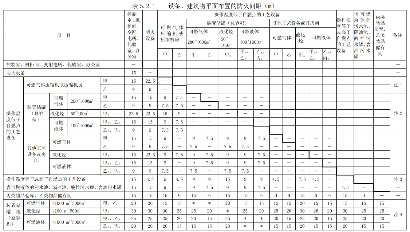 吸取国外有关标准的适用部分。本规范表5.2.1的项目和防火间距,与大部分国外工程公司的有关防火和装置平面布置规定基本一致。