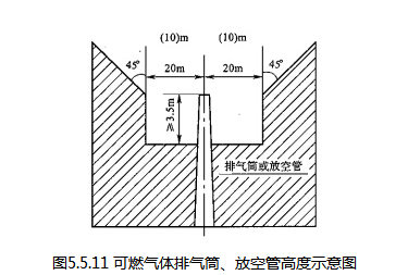 1.连续排放的排气筒顶或放空管口应高出20m范围内的平台或建筑物顶3.5m以上,位于排放口水平20m以外斜上45°的范围内不宜布置平台或建筑物(图5.5.11);