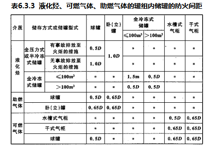 6.3.3 液化烃、可燃气体、助燃气体的罐组内,储罐的防火间距不应小于表6.3.3的规定。