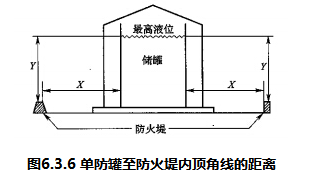 单防罐至防火堤内顶角线的距离X不应小于最高液位与防火堤堤顶的高度之差Y加上液面上气相当量压头的和(图6.3.6);当防火堤的高度等于或大于最高液位时,单防罐至防火堤内顶角线的距离不限;