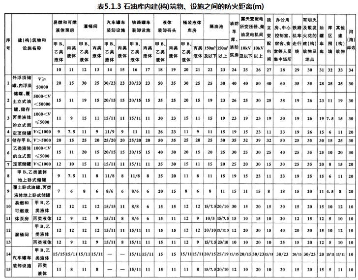 5.1.3 石油库内建(构)筑物、设施之间的防火距离(储罐与储罐之间的距离除外),不应小于表5.1.3的规定。