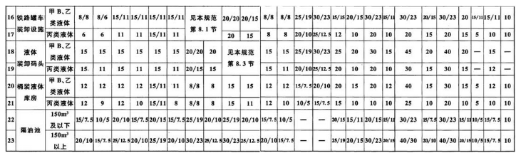 3 序号16中,分子数字为用于装车作业的铁路线与建(构)筑物或设施的防火距离,分母数字为采用油气回收设施的铁路罐车装卸设施或仅用于卸车作业的铁路线与建(构)筑物的防火距离。