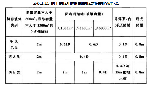 6.1.15 地上储罐组内相邻储罐之间的防火距离不应小于表6.1.15的规定。
