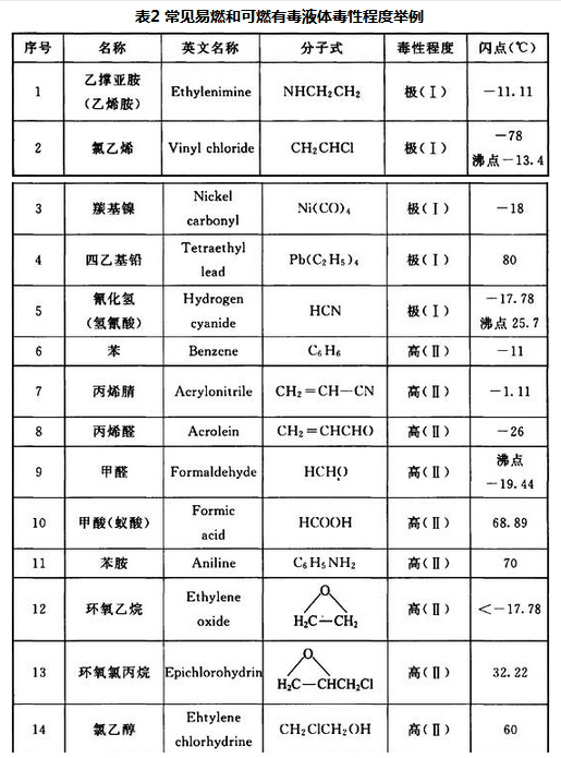 6.1.8 限制储存Ⅰ、Ⅱ级毒性的甲B、乙A类液体储罐容量是为了降低其事故危害性,氮封保护系统可有效防止储罐发生爆炸起火事故,进一步加强有毒液体储罐的安全可靠性。常见易燃和可燃有毒液体毒性程度举例见表2。