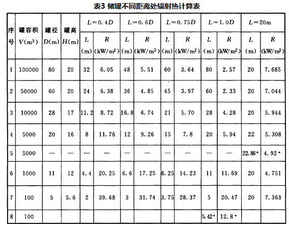 注:1 表中的火灾辐射热强度是按储罐发生全面积火灾计算出来的。