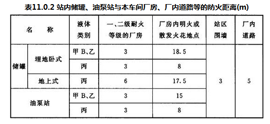 1)站内储罐、油泵站与本车间厂房、厂内道路等的防火距离,不应小于表11.0.2的规定;