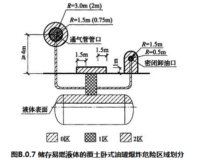 B.0.7 储存易燃液体的覆土卧式油罐爆炸危险区域划分(图B.0.7),应符合下列规定: