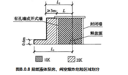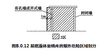 B.0.12 易燃液体重桶库房的爆炸危险区域划分(图B.0.12),其建筑物内空间及有孔或开式墙外1m与建筑物等高的范围内的空间,应划为2区。