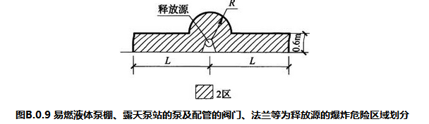B.0.9 易燃液体泵棚、露天泵站的泵和配管的阀门、法兰等为释放源的爆炸危险区域划分(图B.0.9),应符合下列规定: