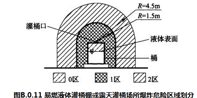 B.0.11 易燃液体灌桶棚或露天灌桶场所的爆炸危险区域划分(图B.0.11),应符合下列规定: