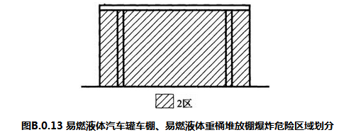 B.0.13 易燃液体汽车罐车棚、易燃液体重桶堆放棚的爆炸危险区域划分(图B.0.13),其棚的内部空间应划为2区。