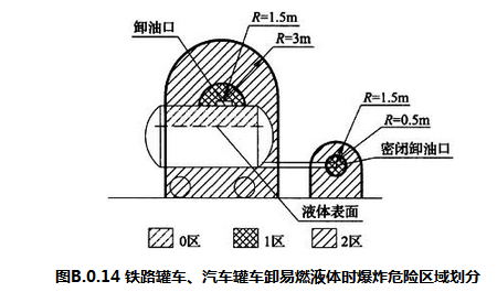 B.0.14 铁路罐车、汽车罐车卸易燃液体时爆炸危险区域划分(图B.0.14),应符合下列规定: