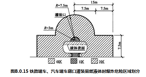 B.0.15 铁路罐车、汽车罐车敞口灌装易燃液体时爆炸危险区域划分(图B.0.15),应符合下列规定: