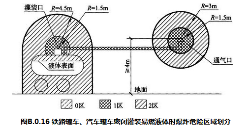 B.0.16 铁路罐车、汽车罐车密闭灌装易燃液体时爆炸危险区域划分(图B.0.16),应符合下列规定: