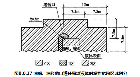B.0.17 油船、油驳敞口灌装易燃液体时爆炸危险区域划分(图B.0.17),应符合下列规定: