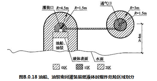 B.0.18 油船、油驳密闭灌装易燃液体时爆炸危险区域划分(图B.0.18),应符合下列规定: