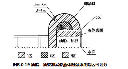 B.0.19 油船、油驳卸易燃液体时爆炸危险区域划分(图B.0.19),应符合下列规定: