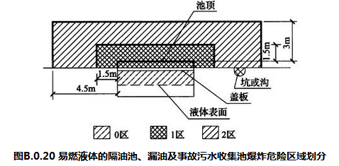 B.0.20 易燃液体的隔油池、漏油及事故污水收集池爆炸危险区域划分(图B.0.20),应符合下列规定: