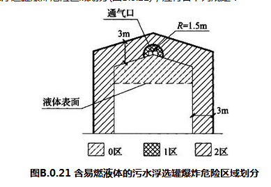 B.0.21 含易燃液体的污水浮选罐爆炸危险区域划分(图B.0.21),应符合下列规定: