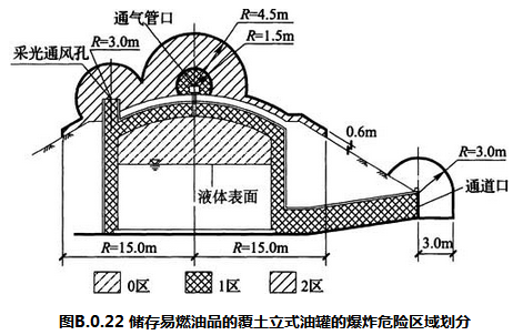B.0.22 储存易燃油品的覆土立式油罐的爆炸危险区域划分(图B.0.22),应符合下列规定: