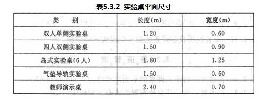 1 实验桌平面尺寸应符合表5.3.2的规定;
