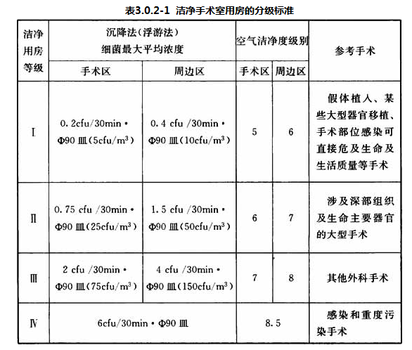 3.0.2 关于手术部用房的分级、参考手术以及菌浓指标说明如下: