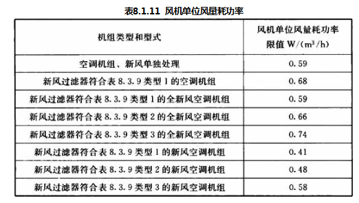 8.1.11 现行国家标准《公共建筑节能设计标准》GB 50189对空调风机的单位风量耗功率的限值作出了规定,不过该标准没有考虑医院洁净手术部空调机组和新风机组的应用情况。本条的规定是对该标准的补充。