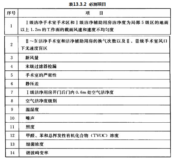 13.3.2 工程检验的必测项目应符合表13.3.2的规定,风速、风量和静压差应先测,细菌浓度应最后检测。