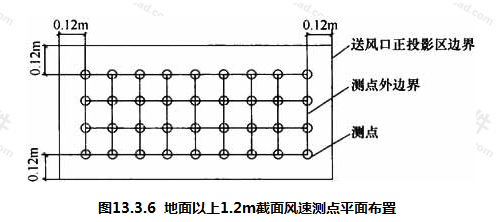 3 测点范围应为集中送风面正投影区边界0.12m内的面积,均匀布点,测点平面布置(图13.3.6)测点高度距地1.2m,应无手术台或工作面阻隔,测点间距不应大于0.3m。当有不能移动的阻隔时,应记录在案。