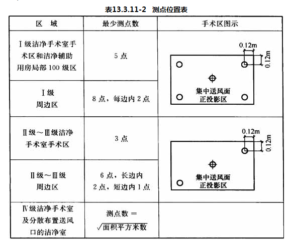 2 当送风口集中布置时,应对手术区和周边区分别检测,测点数和位置应符合表13.3.11-2的规定,测点数不少于3点;当附近有显著障碍物时,可适当避开;应避开送风口正下方:当送风口分散布置时,应按全室统一布点检测,测点可均布,但不应布置在送风口正下方。