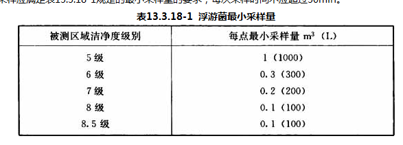 3 当采用浮游法测定浮游菌浓度时,细菌浓度测点数应和被测区域的含尘浓度测点点数相同,且宜在同一位置上。每次采样应满足表13.3.18-1规定的最小采样量的要求,每次采样时间不应超过30min。