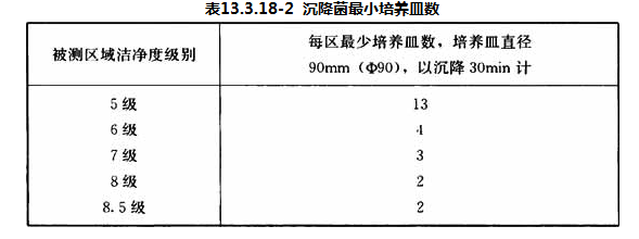 4 当用沉降法测定沉降菌浓度时,细菌浓度测点数应和被测区域含尘浓度测点数相同,同时应满足表13.3.18-2规定的最少培养皿数的要求。