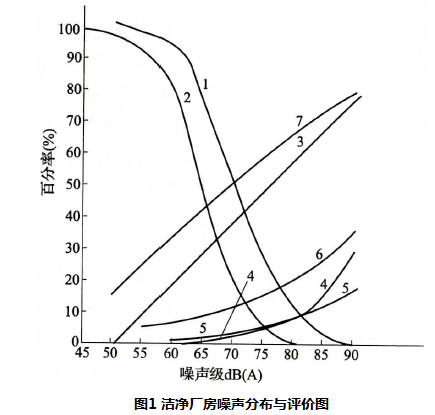 根据“洁净厂房噪声评价与标准的研究”所得到的成果,我国59个洁净厂房平均噪声级的分布,电子工业216个洁净室的噪声分布状况和不同声级下各种效应的主观评价指标如图1所示: