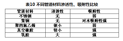 不同材料的管道对气体和水的渗透、吸附能力见表10。