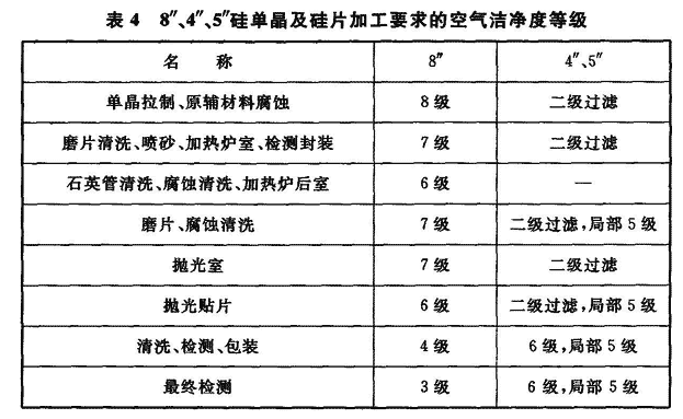1 表4~表6分别列出8″和4″、5″硅单晶及硅片加工、集成电路的芯片制造、TFT-LCD生产所需的空气洁净度等级、温度、湿度的实例。