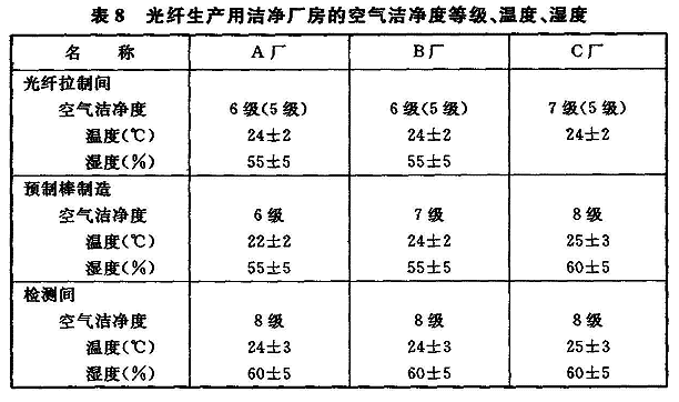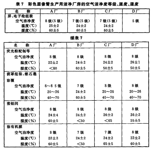 2微硬盘驱动器(HDD)生产用洁净厂房 溅射生产区4级:01pm、23士1℃、45%土5%; 组装、测试等6级:03pm、23土2℃、45%土10%。 3高密度磁盘生产用洁净厂房 1)切带间、带基间、涂布间、固化间等6级:0.5m、23士1℃、50士5%,其中,涂布间的头部要求5级; 2)组装间7级:0.5m、23士2℃、50土10%; 3)配件间、化验室8级:0.5pm、24士3℃、50士10%。 4表7、表8分别列出彩色显像管生产、光导纤维生产所需的空气洁净度等级、温度、湿度的实例。